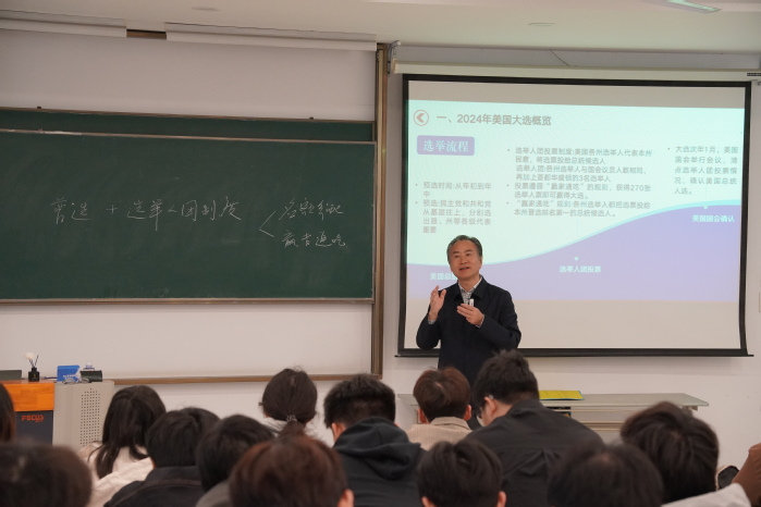汤正华以《2024年美国大选及对中美关系的影响》为题,从2024年美国大选的概览、形势及其结果、美国大选对中美关系的影响和中美关税战等四个方面进行讲授。课堂中,他紧密结合当代大学生的思想特点,运用鲜活案例和通俗语言,深入浅出地解读了中美关系政策动向。最后,他寄语青年学子要胸怀国之大者,将个人专业成长与国家发展需求紧密结合,在服务国家战略中实现人生价值。
