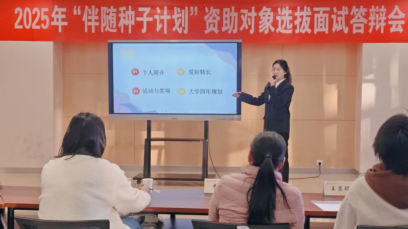 答辩现场采用“个人自述+评委提问”的形式。评委组围绕候选人家庭情况、个人发展规划、综合素质表现等核心维度进行量化打分,同时从语言表达能力、责任担当意识、问题应对能力等方面开展细致考察。经综合评审,最终从14名候选人中确定10名优秀学生成为2025年“伴随种子计划”成员。