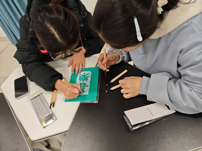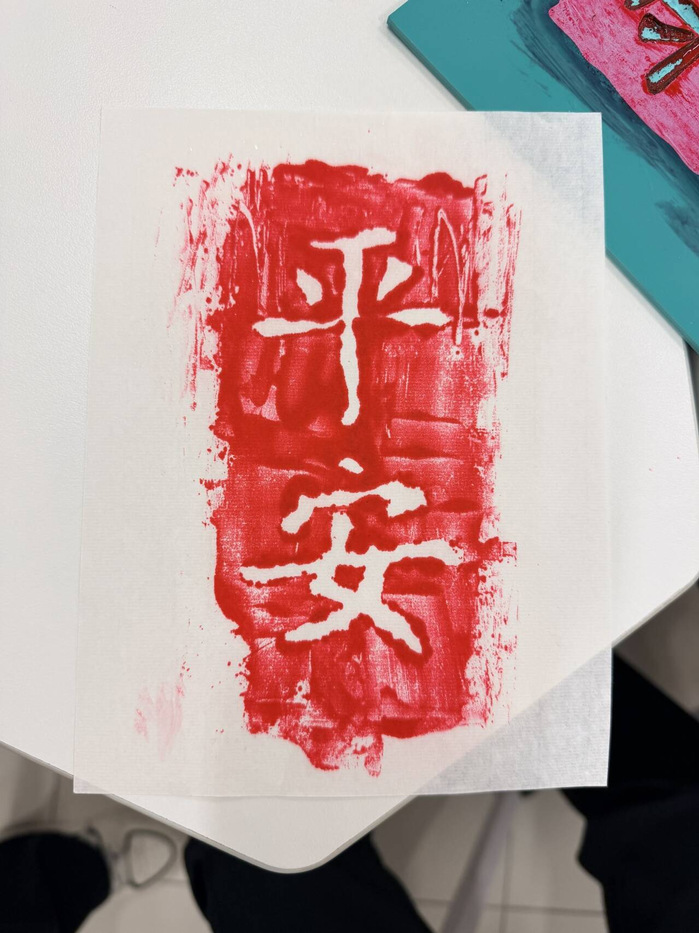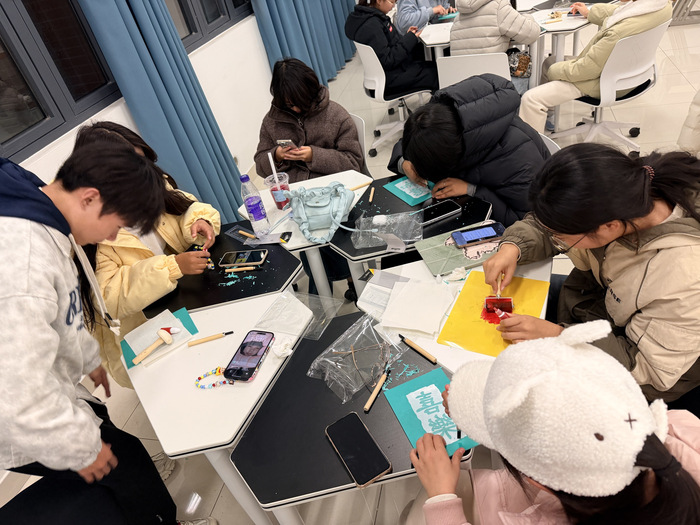实践环节,同学们两两一组,领取特制橡胶板、安全刻刀等材料,在视频教程与工作人员指导下刻制,全神贯注锤炼专注与匠心。雕刻完成后,进入刷墨拓印阶段,同学们亲手操作,揭纸见清晰图案时,现场满是喜悦与惊叹,拓印作品成为非遗“活态传承”的见证。