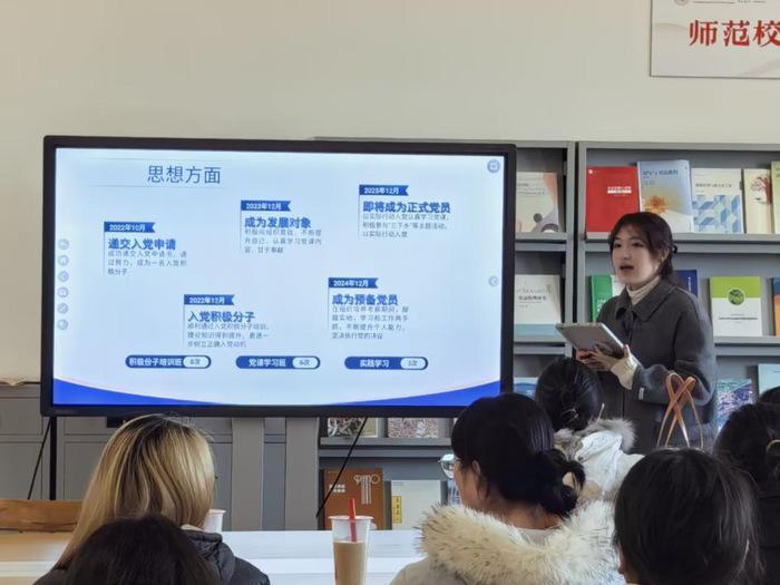 在分享环节,成依凡从思想与学业多维度分享,大一至大三综测和专业课成绩名列前茅且积极参与赛事,同时提醒同学们做好时间管理以提升效率、明确目标;董贝贝围绕坚持师范精神、学生工作认知、就业规划及课外实践分享,强调管理是服务与引领,为基础教育方向同学提供求职建议,并鼓励珍惜自我提升机会;蒋佳言则强调学业为重,以“学无止境”为信条,大二、大三专业成绩与综评均居专业第一,还建议师范专业学生将专业知识融入实践以锤炼素养,希望同学们做实做深各阶段应做之事,找到自身向上之路。